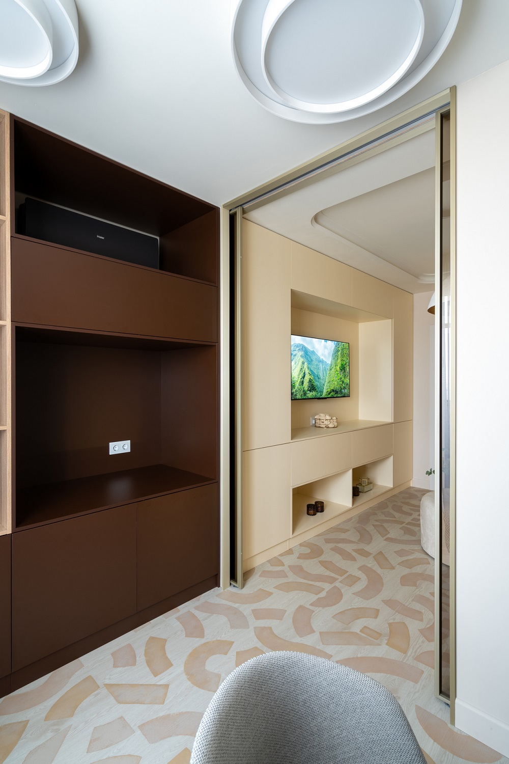Пол — особая «фишка» этого проекта. На кварцевом ламинате Fargo Comfort Ясень Белый JC18001-35 с помощью трафаретов оформили узоры, сделав пол акцентом.