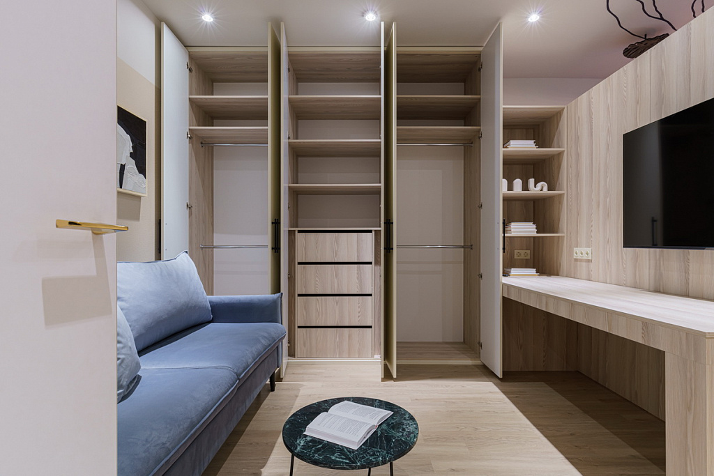 Спальню-гостиную покрасили в бежевый цвет, в центре комнаты возвели стену, а потолок украсила роскошная ветвь. Дизайнеры искали светлый, эстетичный и практичный пол и остановились на кварцевом ламинате Fargo Comfort Ясень Белый JC18001-35.